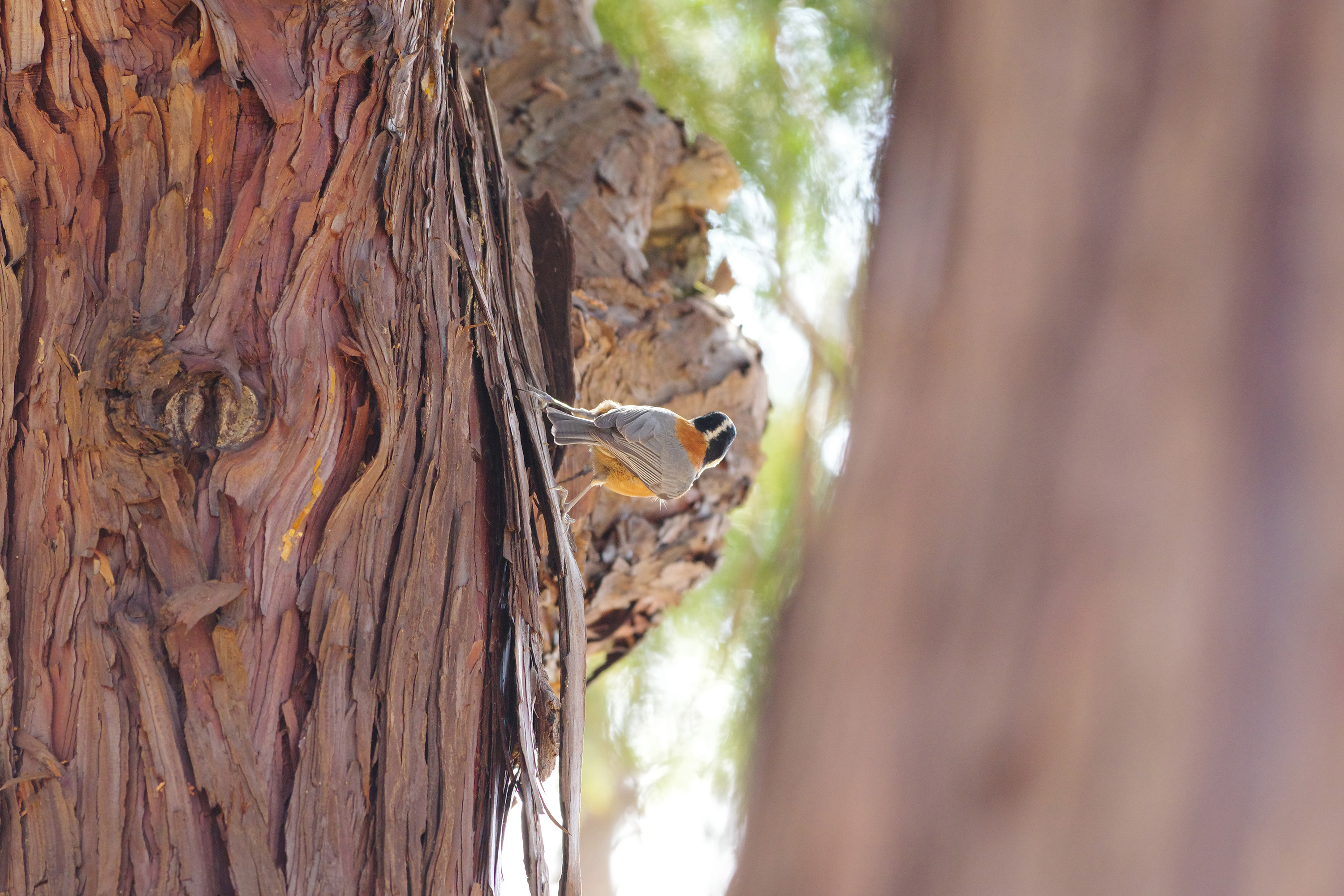 額からうなじにかけての黒い模様とのどに大きな三角形の黒い模様があり、背中の上部とお腹が鮮やかな橙色をしています。名前の通り、スズメくらいの大きさで少し標高の高い山地で暮らしていることが多いですが、気温が低くなってくる冬などは平地に降りてくることもあり、市街地でも見ることができます。